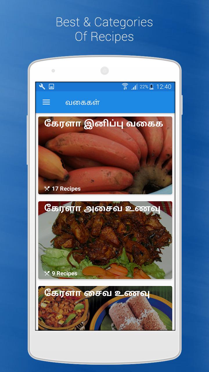 Kerala Recipes Tips In TamilKerala Recipes Tips In Tamil app includes 500+ delicious and tastiest kerala recipes you can imagine.This app gives you a varieties of dishes which are delicious to eat. Traditional Kerala Dishes are also included in our app which makes you addict to the Kerala recipes. Kerala Samayal in Tamil guides you to learn the different recipes at the short time.In this application, you will find tasty recipes for chicken, beef, fish, rice, breakfast, payasam, sadhya, and many more. Kerala cuisine offers a multitude of both vegetarian and non-vegetarian dishes prepared using fish, poultry and red meat with rice a typical accompaniment. Chillies, curry leaves, mustard seeds, tamarind and asafoetida are all frequently used.All recipes are healthy and easy to prepare . This app helps the user to know and understand Kerala and South Indian food culture. Includes vegetarian and non-vegetarian breakfast, lunch, dinner and snack recipes.Kerala Recipes is designed to give simple and familiar user experience.Features :- More Than 500+ Kerala Recipes- All Recipes are detailed in Tamil- Delicious recipes with photos- Attractive User Interface- Clear and best so you can view and make it clearly- Time taken for preparation- Bookmark your favorite recipesDownload the free app & enjoy cooking.