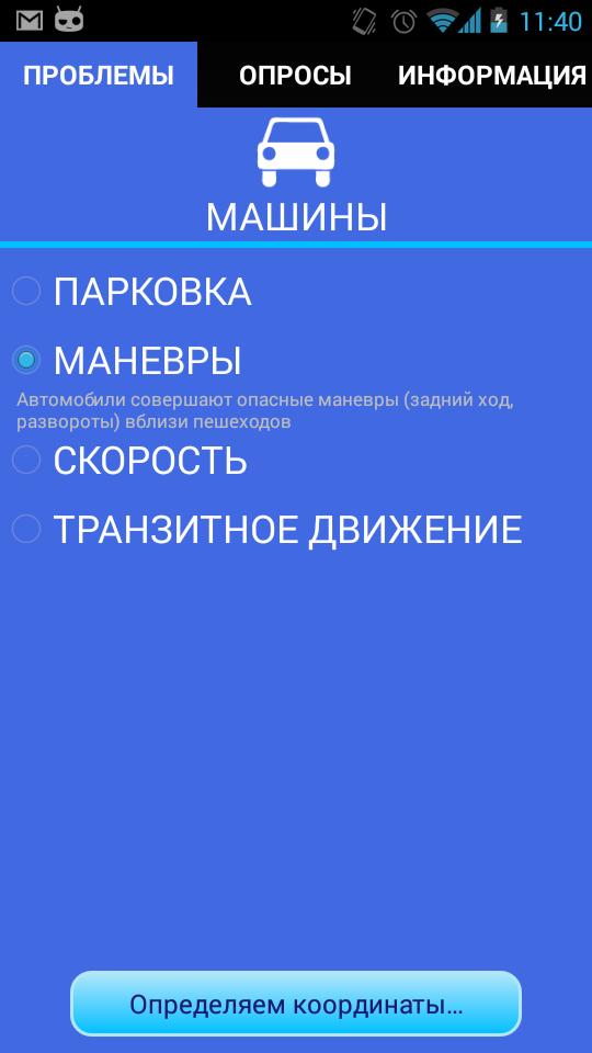 Just start the application and wait until your location is determined on the map, then select the type of problem in two clicks and send the information to the processing center. Go further along the route and mark all the dangerous places.