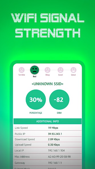 With just one tap, Wifi Signal Strength Meter & SuperWifi Speed Test will test internet speed and show accurate broadband speed test results quickly.