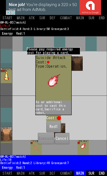 Play robot, operation and warship card by use the energy to defeat your opponent.