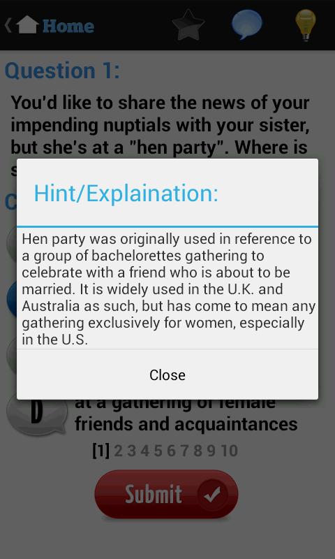 Diese App fordert Sie nicht nur auf, die beste Bedeutung von Slang -Wörtern, Redewendungen und Umgangssprache in drei unterschiedlichen Ebenen zu finden: Einfach, durchschnittlich und hart… sondern hilft Ihnen auch, einige neue Slang -Wörter aus den spezifischen Regionen in den USA zu kennen.