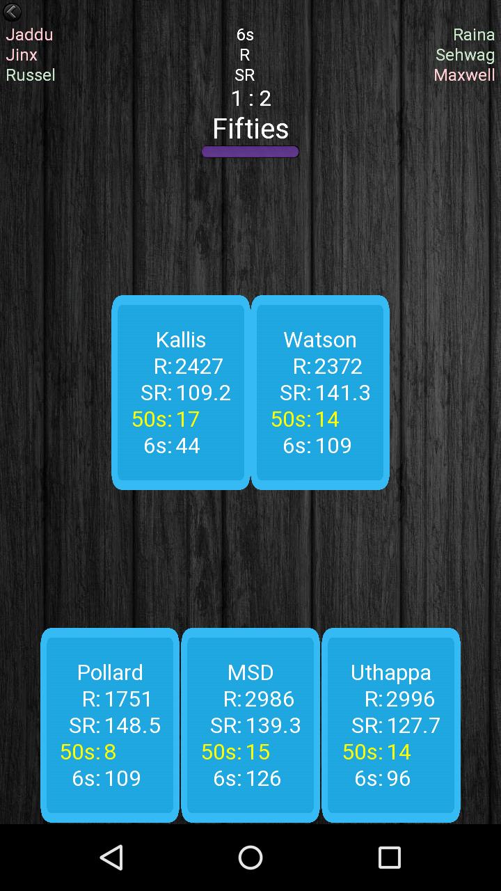 3. Each card has 4 statistics (Ex: Runs, Sixes, Fours, Fifties). (that's why "Battle of Stats"!!)
