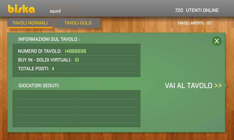 Spielen Sie mit über 450.000 registrierten Spielern Burraco online und bald auch auf andere beliebte Kartenspiele im großen Multiplayer -Netzwerk von Biska.com. Die Spieloberfläche ist einfach und intuitiv und ermöglicht es Ihnen, denselben Biska -Benutzer zu verwenden, ohne eine neue Registrierung ausführen zu müssen. Wenn Sie kein Konto haben, können Sie sich in einem Klick registrieren!