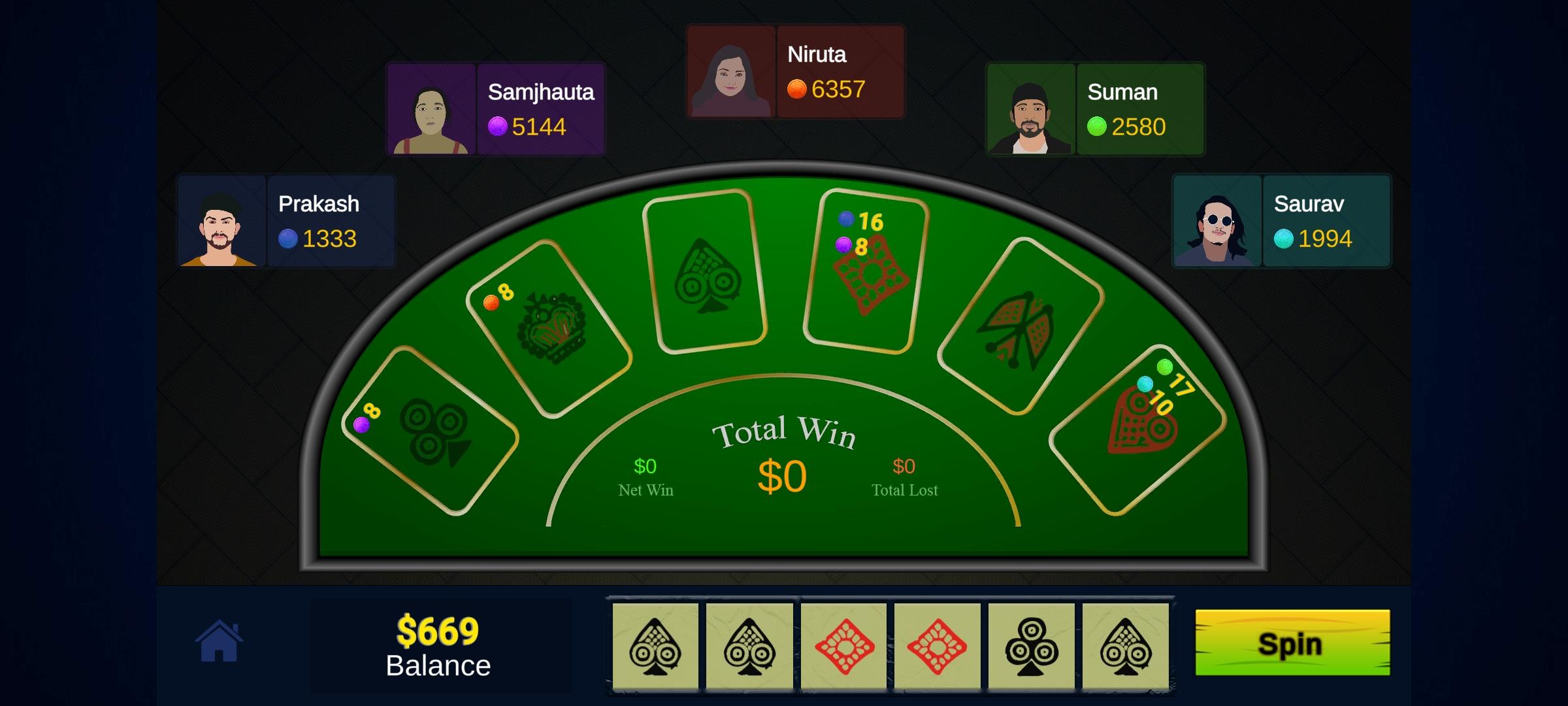 In diesem Spiel haben wir Symbole "Hören", "Spade", "Diamond", "Club", "Face" und "Flag", gedruckt auf den sechs Gesichtern jedes Würfels. Da es sich um ein Wettspiel handelt, wird eine Person das Spiel hosten und die anderen können ihre Wetten auf eines der sechs Symbole platzieren. Der Spieler wird eine Wette platzieren und der Host rollt die Würfel.