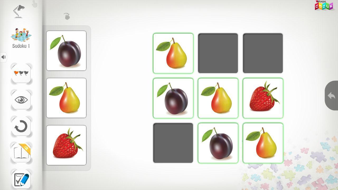 Ein lustiges Logikspiel für 3+, 4+ und 5+, mit Rätseln bei drei Schwierigkeitsgraden für verschiedene Altersgruppen (3x3, 4x4 und 6x6). Zwei Sprache: Türkisch und Englisch.