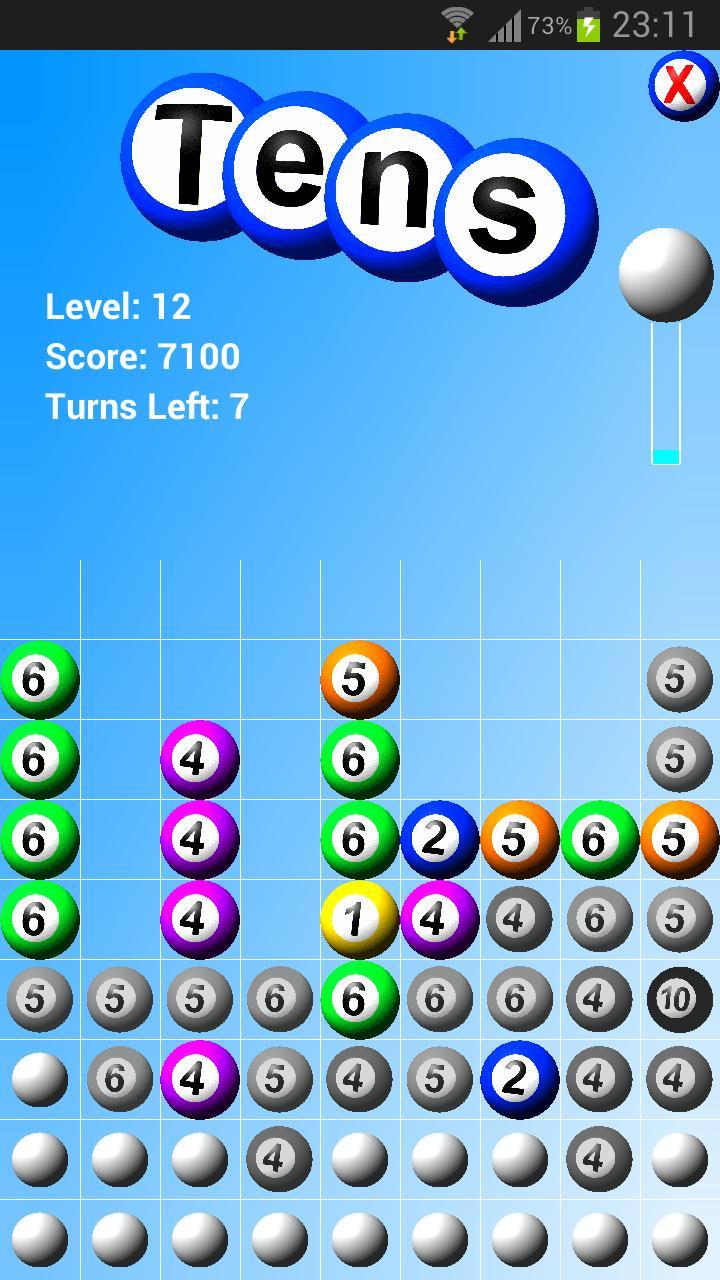 Es gibt auch eine Bonusbar mit einem Ball oben. Während sich Ihre Partitur aufbaut, steigt diese Bar, bis sie an der Spitze erreicht ist und ein Bonus 10 -Ball aktiviert wird. Tippen Sie auf diese und dann wird jeder Ball im Raster, in dem Sie tippen, zu einem aktivierten 10, der sich auflöst. Der Bonus setzt dann zurück. Mit dem Fortschritt des Niveaus steigt dieser Bonus immer langsamer. Je größer das Netz ist, desto langsamer steigt der Fortschrittsbalken.