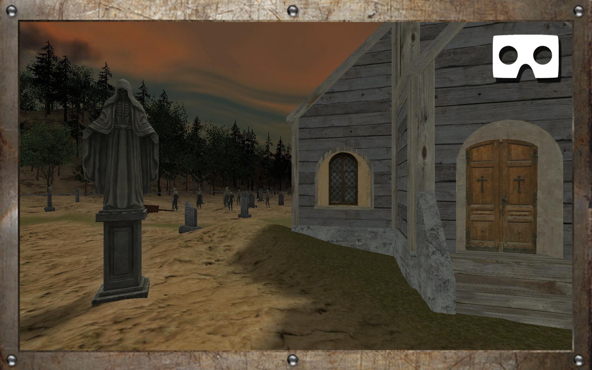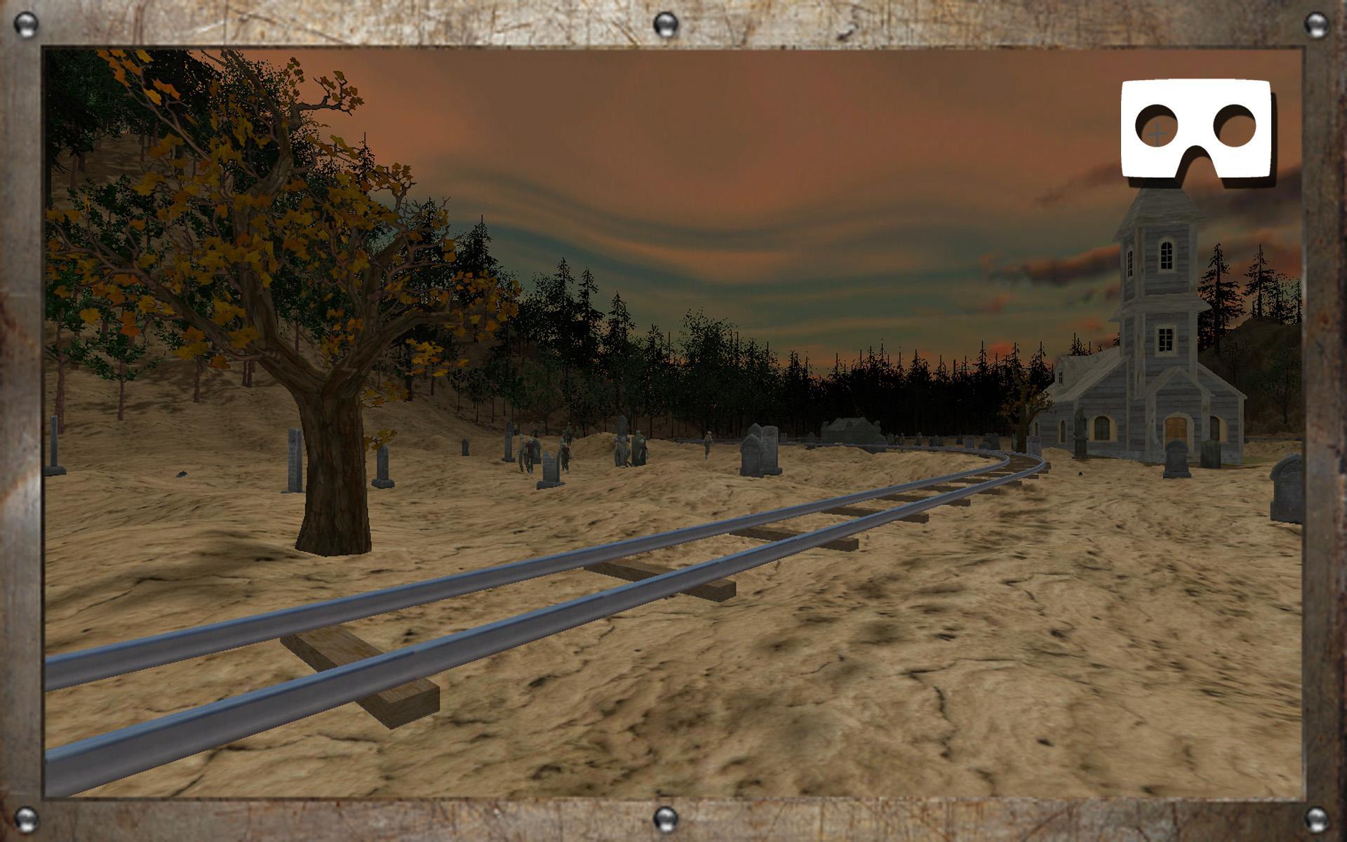 Horror -Zugfahrt durch Spukwald und verlassener Friedhof mit bösen Zombies für Google Cardboard oder ähnliches VR -Headset. Für dieses VR -Spiel sind keine Berührungssteuerungen erforderlich.