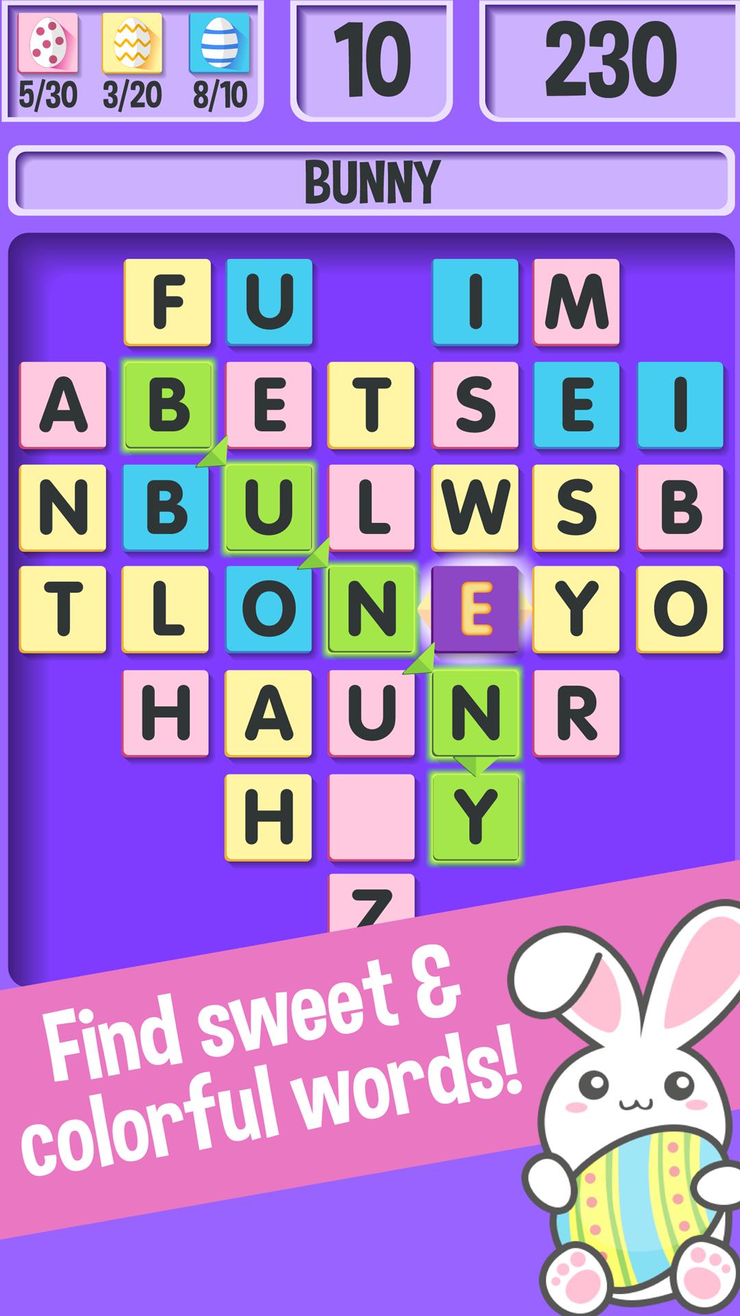 ¡Sea el mejor conejito del negocio recolectando lindos huevos de Pascua de color dulce! Salta a través de mundos con temática de Pascua, manteniendo tus ojos en el premio. ¡No dejes que algunas zanahorias de aspecto sabroso o chocolate te distraigan! Simplemente deslice los dedos sobre las baldosas para crear palabras ~ ¡Cuanto más largo, mejor!