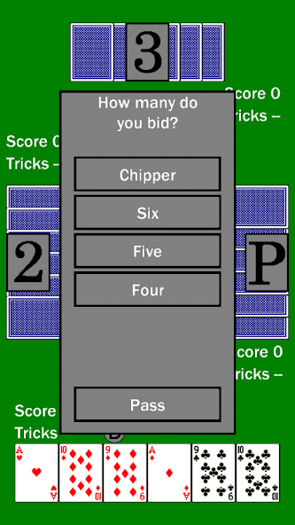 Chipper es un juego de cartas jugado en West Central Wisconsin y sus alrededores. Si estás familiarizado con Euchre o cualquier juego de cartas de toma de trucos, debería ser un juego fácil de recoger. Juega contra 3 jugadores de computadora para perfeccionar tus habilidades y convertirse en un mejor jugador Chipper .