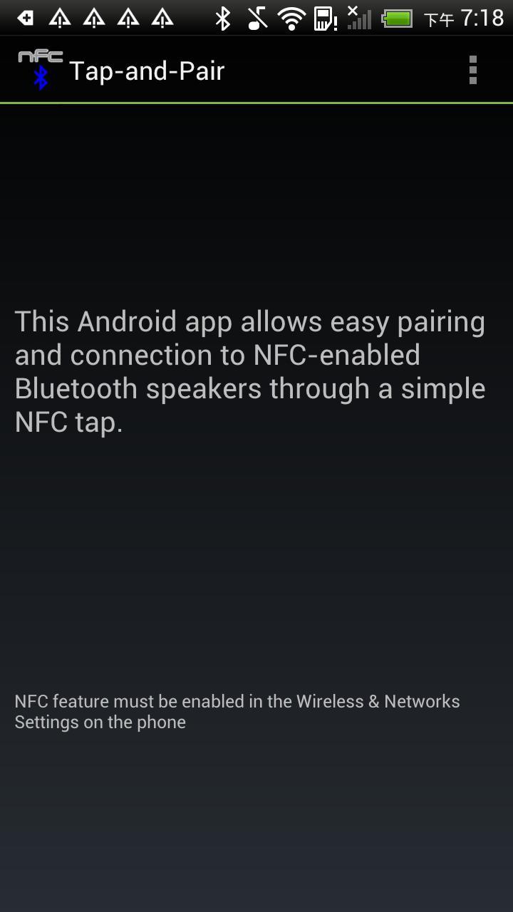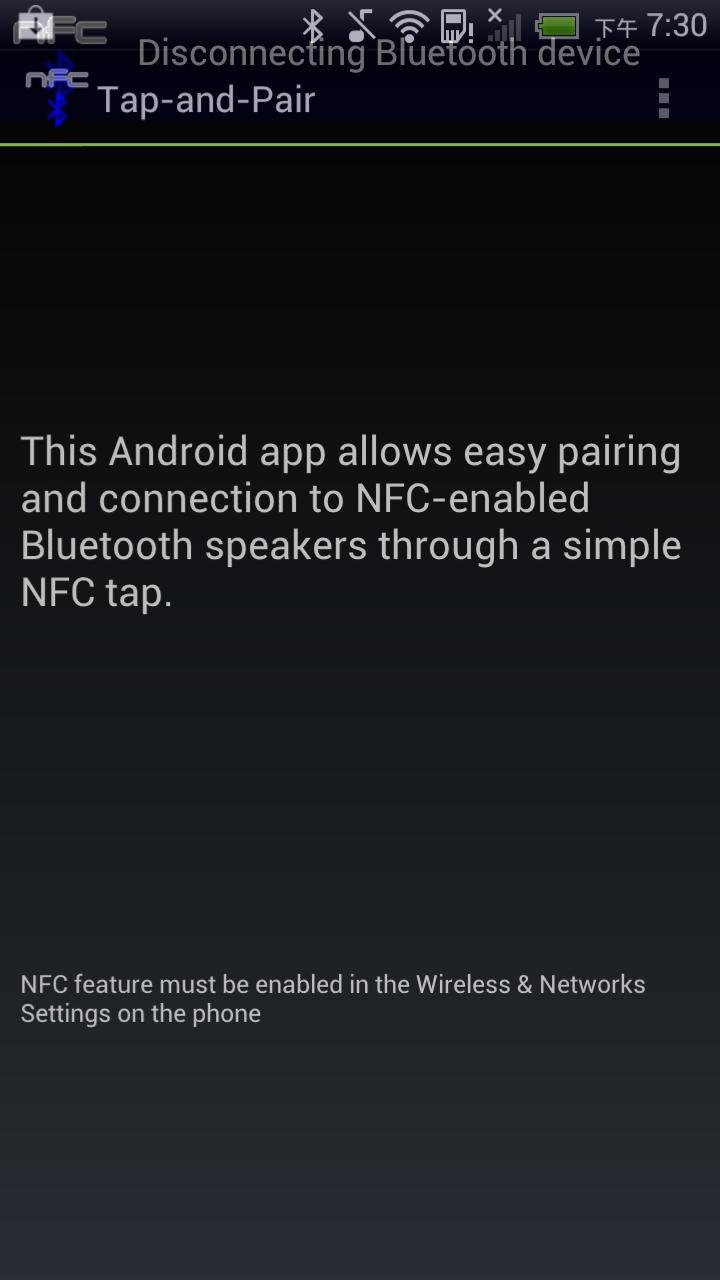 Cette application Android permet un couple et une connexion faciles aux haut-parleurs Bluetooth compatibles NFC via un simple robinet NFC.