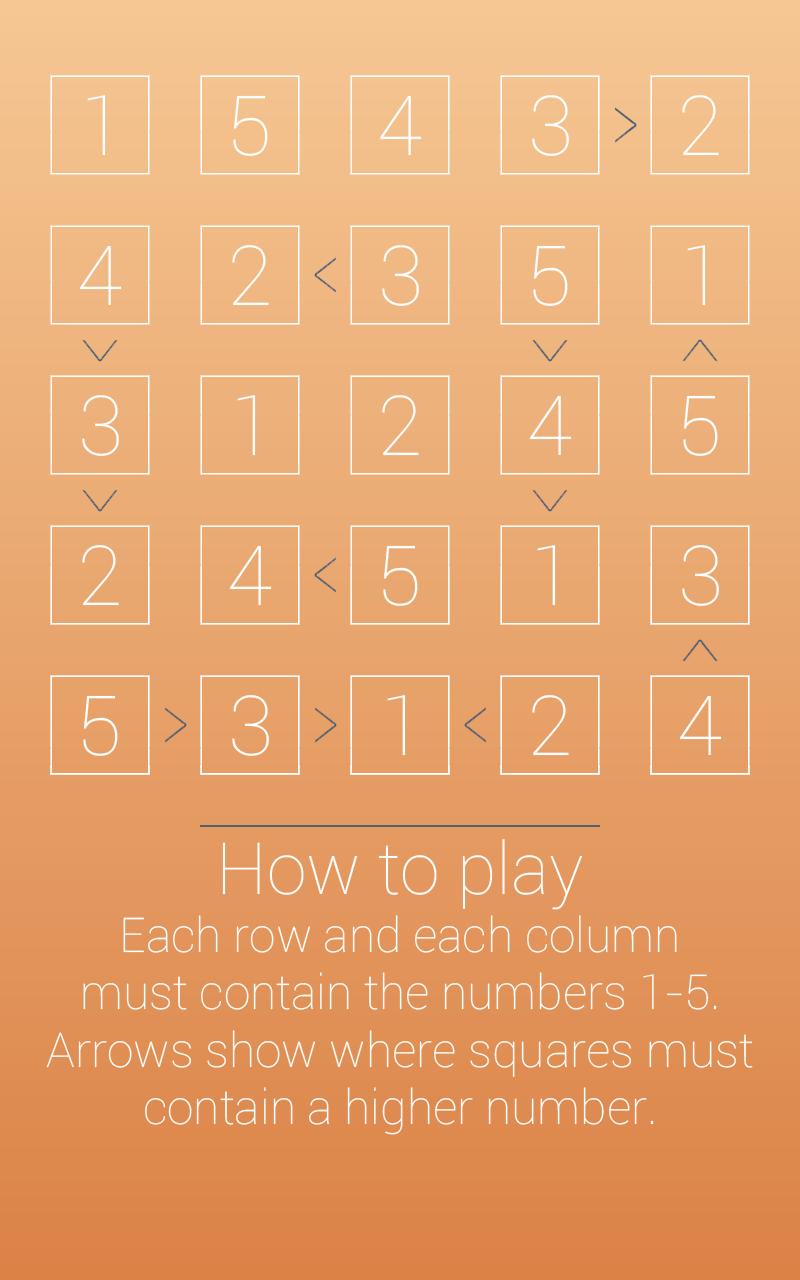 Futoshiki , également connu sous le nom de "inégalité", est un jeu de puzzle logique difficile du Japon. Semblable à Sudoku, l'objectif du jeu est de placer les chiffres 1 à 5 dans une grille, en utilisant les panneaux d'inégalité pour vous aider. Chaque puzzle n'a qu'une seule solution, qui peut être atteinte par une déduction logique intelligente.