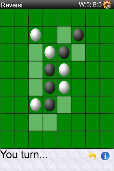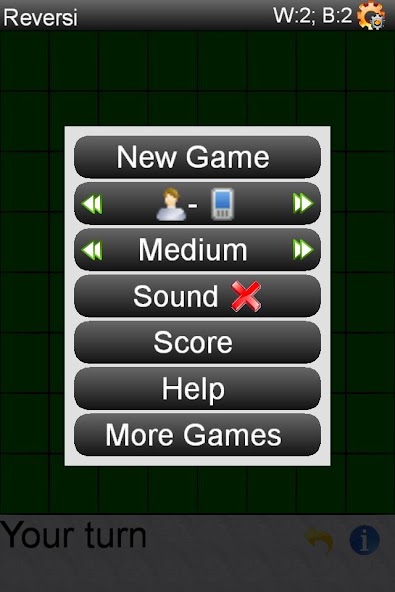 Le jeu est joué en plaçant un morceau (les mouvements possibles sont mis en évidence sur le plateau). Toute la pièce ennemie entre vos pièces existantes et la pièce nouvellement placée (verticalement, horizontalement ou diagonale) sera convertie et deviendra la vôtre. Lorsque vous jouez contre le téléphone, vous êtes toujours blanc. Le jeu s'arrête lorsqu'il ne reste plus de mouvements. Utilisez le menu pour contrôler la difficulté, premier mouvement. Vous pouvez configurer le jeu pour jouer contre le téléphone, une autre personne ou même pour voir le jeu entièrement joué seul.