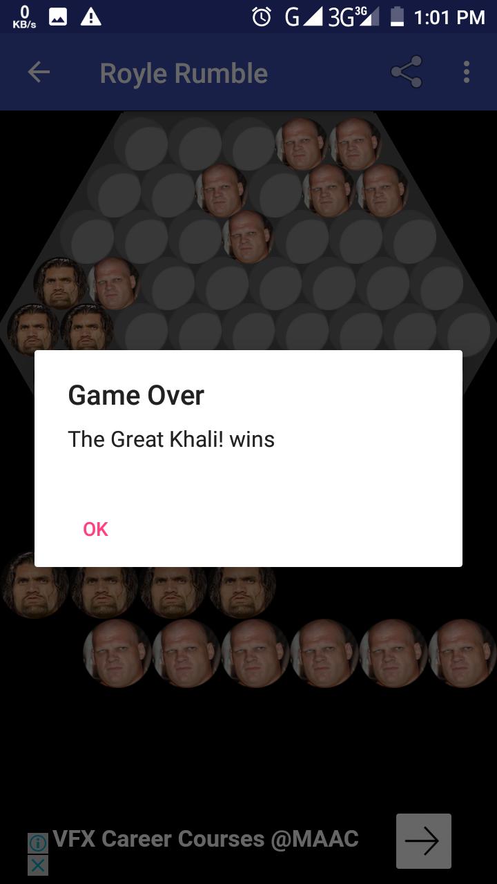 Alternates entre les joueurs, on se déplace à la fois, avec le grand khali! se déplaçant d'abord. Pour chaque mouvement, un joueur déplace une ligne de un, deux ou trois un espace. Un joueur peut pousser son adversaire qui se trouve dans un espace adjacent à leur propre mouvement avec un mouvement en ligne uniquement. Ils ne peuvent pousser que si la ligne de poussée a plus de joueurs que la ligne poussée (trois peuvent en pousser deux ou un; deux peuvent en pousser un). Les joueurs en équipe doivent être poussés dans un espace ouvert (c'est-à-dire non bloqué par un joueur de l'une ou l'autre des couleurs). Le gagnant est le premier joueur à gagner six joueurs d'équipe adverses de l'adversaire.