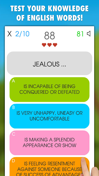 There are 2 game modes to choose from - "Explain word" or "Assign a definition". There are 4 options, choose the correct one, just one option is right! Your score depends on your speed. Obtenez le meilleur score possible en 10 rounds ou 120 secondes limite de temps. Attention, vous pouvez faire des erreurs max 3, sinon votre jeu se termine.