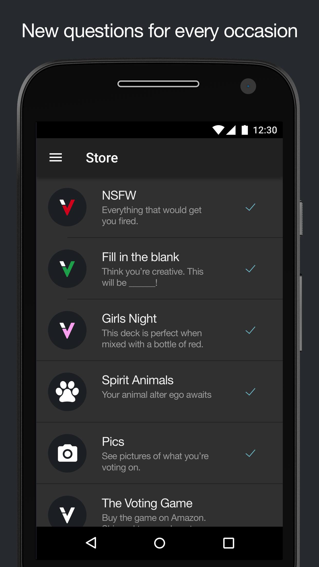 The Voting Game est un jeu de parti pour adultes à propos de nos amis. L'application a tous les nouveaux packs d'extension que vous pouvez commencer à jouer instantanément.