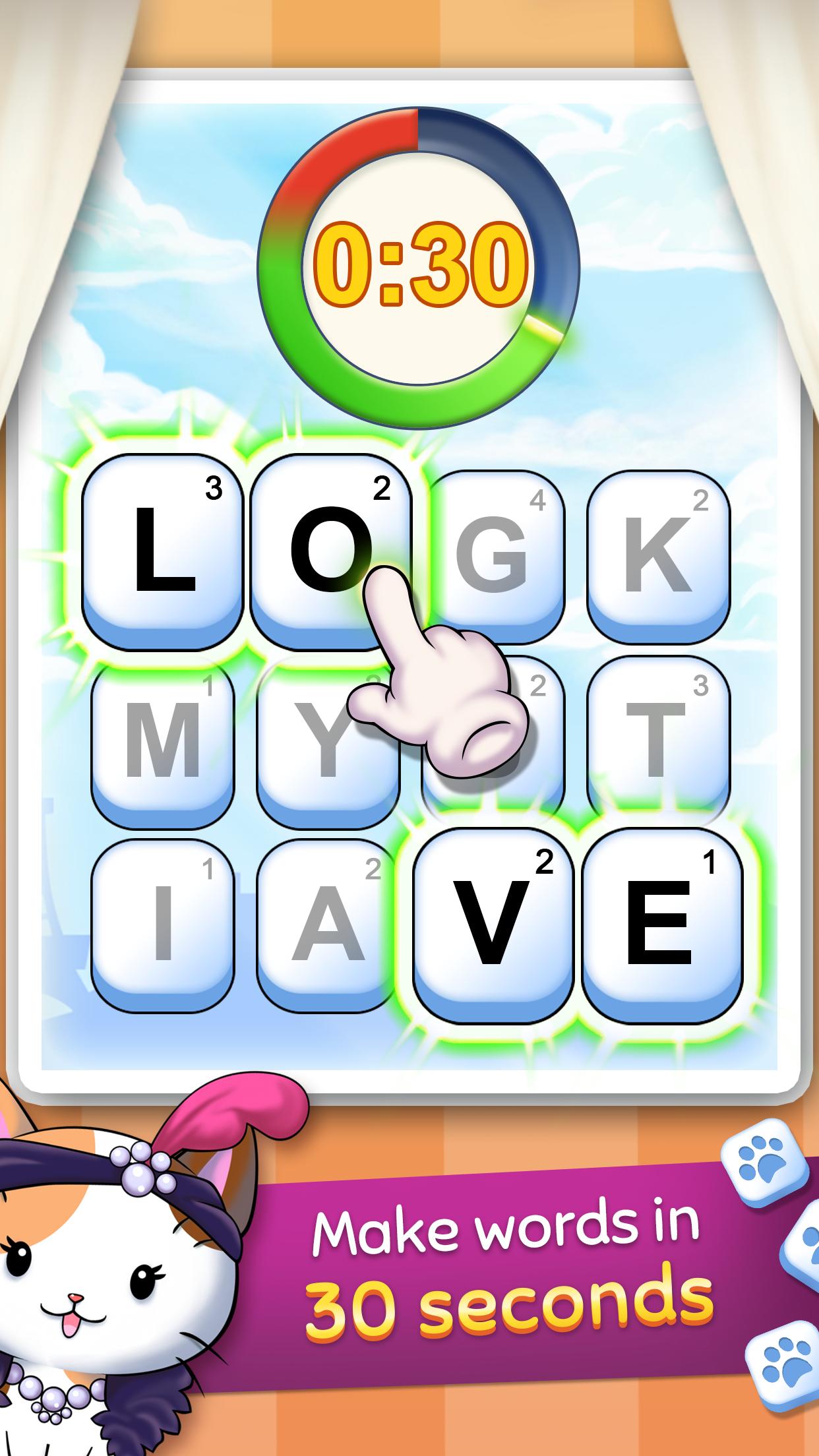 Miaou! Search as many words as you can in 30 seconds. Earn cat coins to complete your collection of cats and share your favourite words with your family and loved ones..