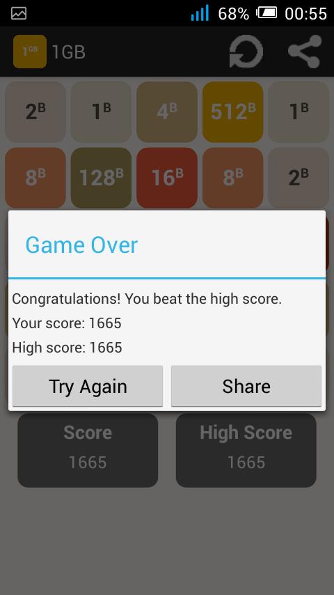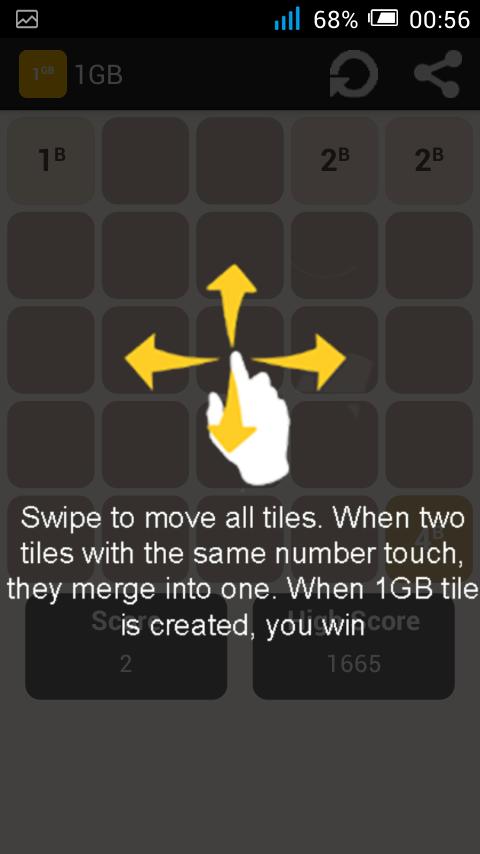 Starting at the 1B (1 byte), swipe (Up, Down, Left, Right) to move the tiles. When two tiles with the same number touch, they merge into one. When 1GB tile is created, you win !