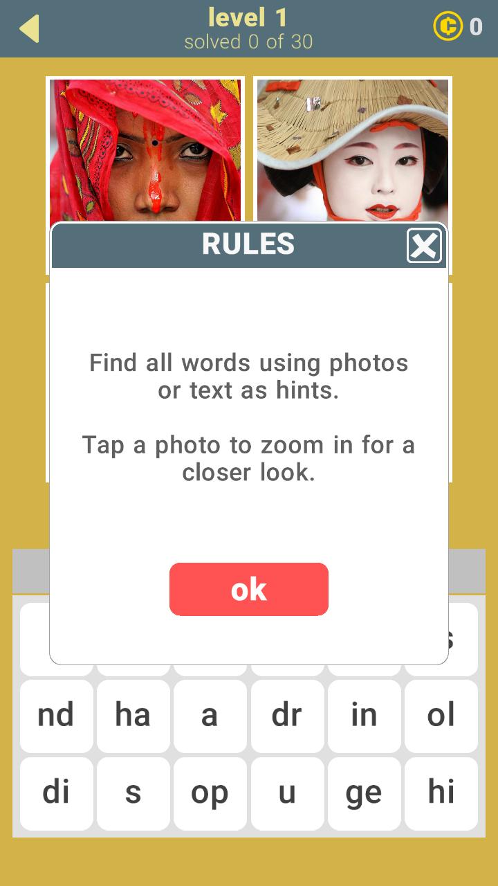 One word per photo. 30 words per level. 660 Words in the game. Can you find all of them? Sometimes you have to think beyond the obvious. Good luck!