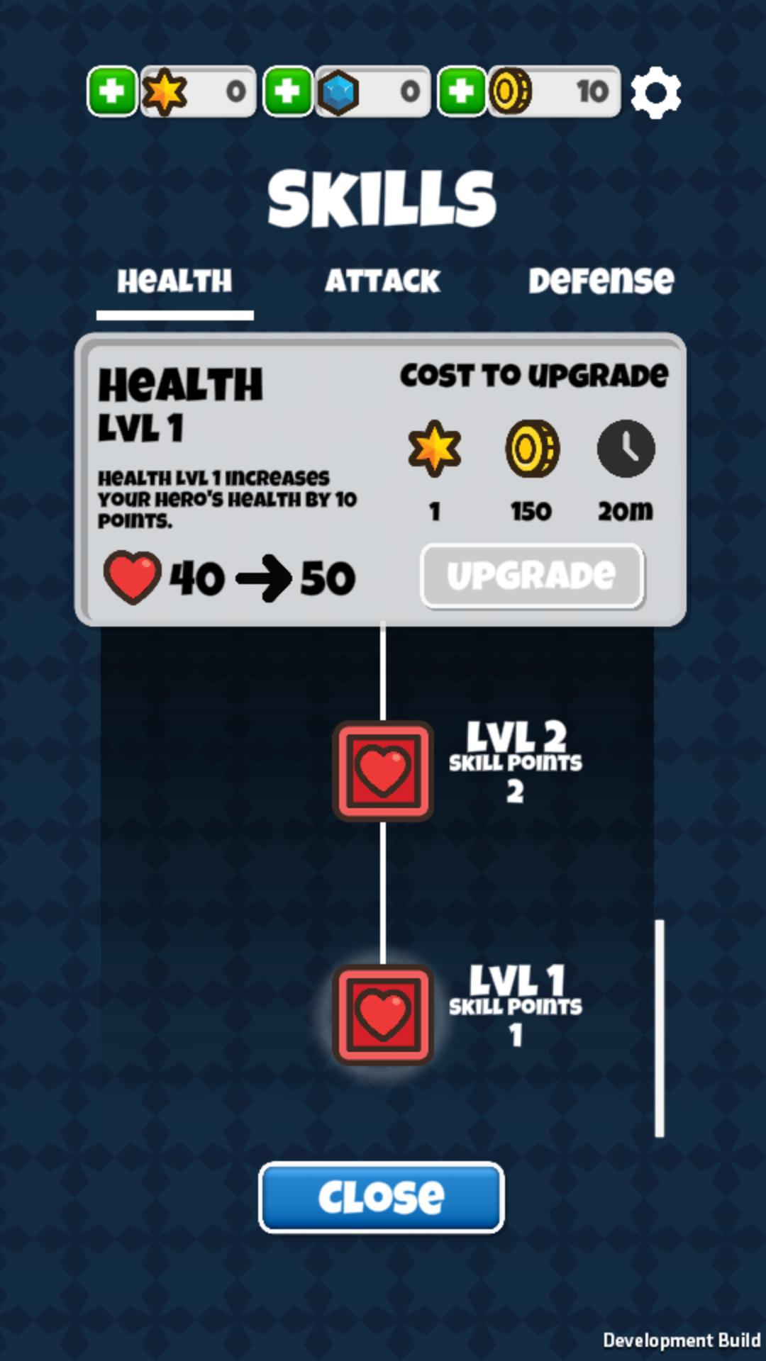 Level up your hero's skills to increase Health, Attack & Defence