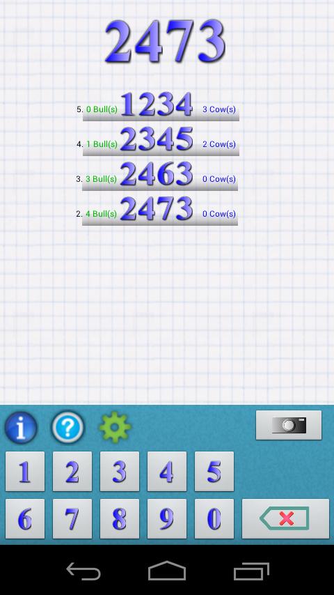 Android writes a 4-digit secret number. The digits must be all different. Then, the player try to guess the number. Android gives the number of matches. If the matching digits are in their right positions, they are "bulls", if in different positions, they are "cows".