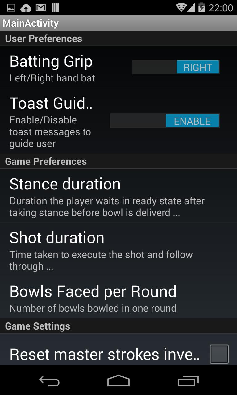 The stroke playing/recording activity displays a virtual bat. Touching the bat anywhere signals batsmen readiness and the bowler starts runup. Once you have gripped the bat take proper batting stance. As the bowler completes his runup and delivers the ball you will hear a beep sound (release of ball). This is when you play your shot. You will then hear a shot, bat striking ball. By this time you must complete your shot. There are setting options which allow you tune the shot playing, runup times as per your preferences.