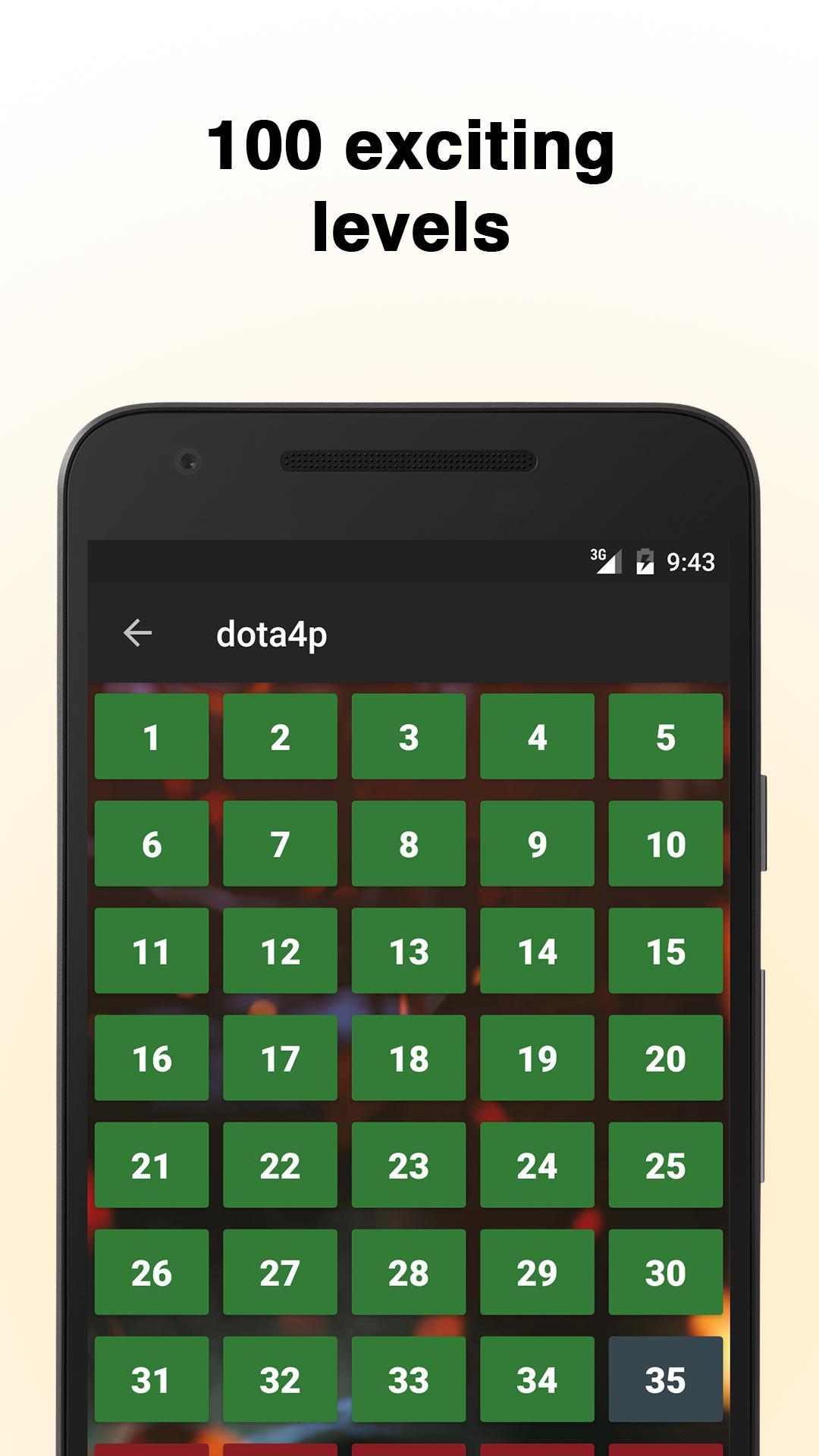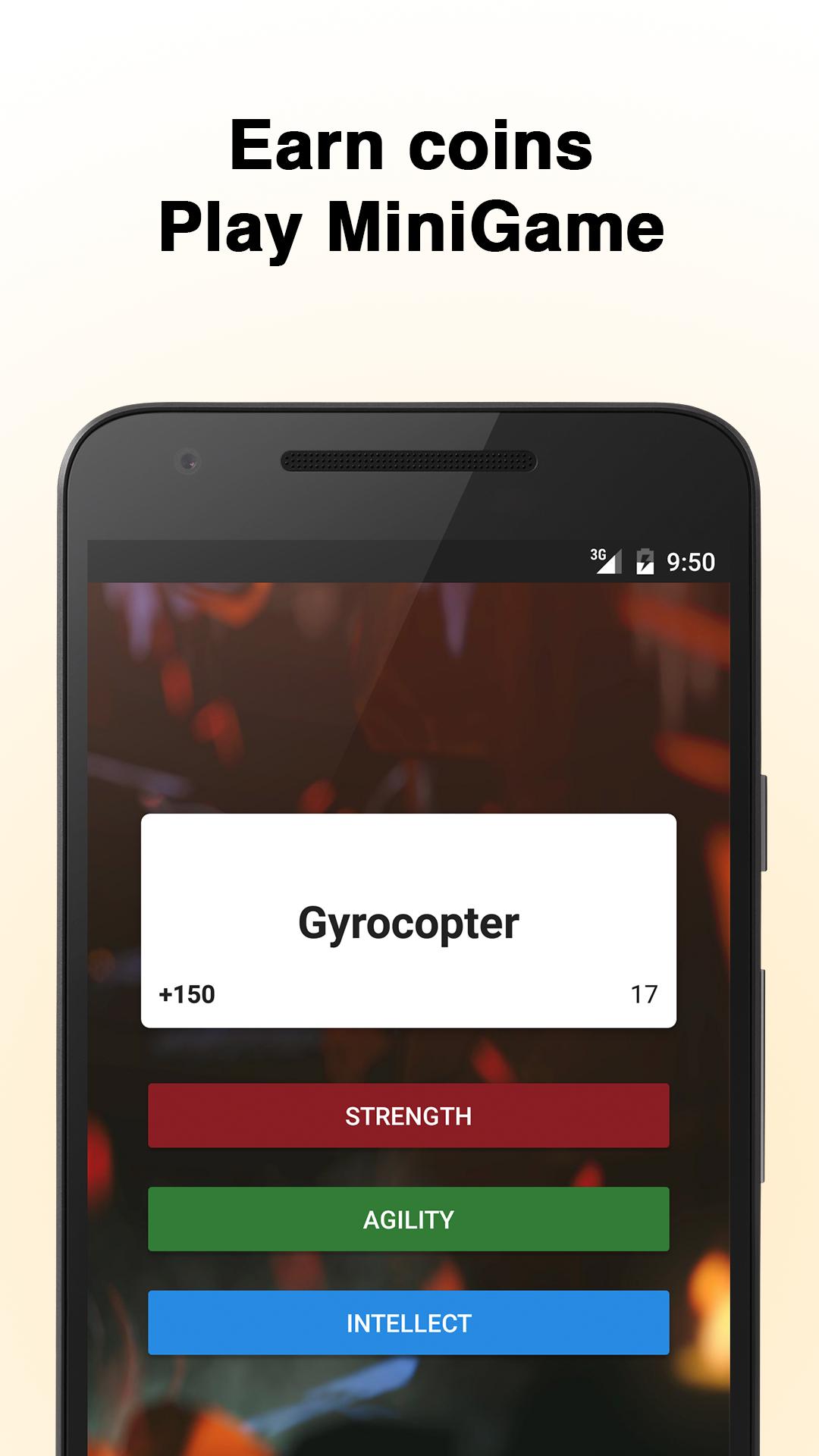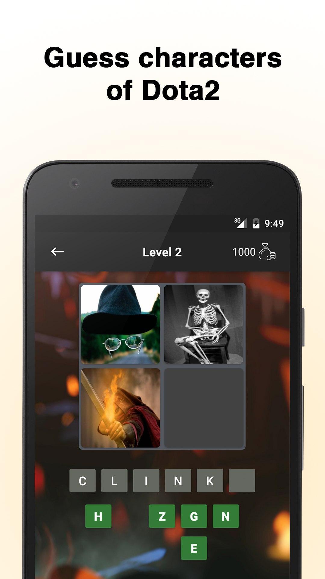 Test yourself on DOTA 2: 100 levels wait you, there are characters and items from the game. You have to find a connection between photos and guess the word, but less than the photos you will open, the greater will be your reward. If you can not pass the level, do not worry, you can always use hints. And when you do not have enough coins to use tips, you can try yourself in a mini-game where you have to correctly identify the characteristics of heroes. But be careful: Each correct answer will bring you 50 coins, and wrong -50.