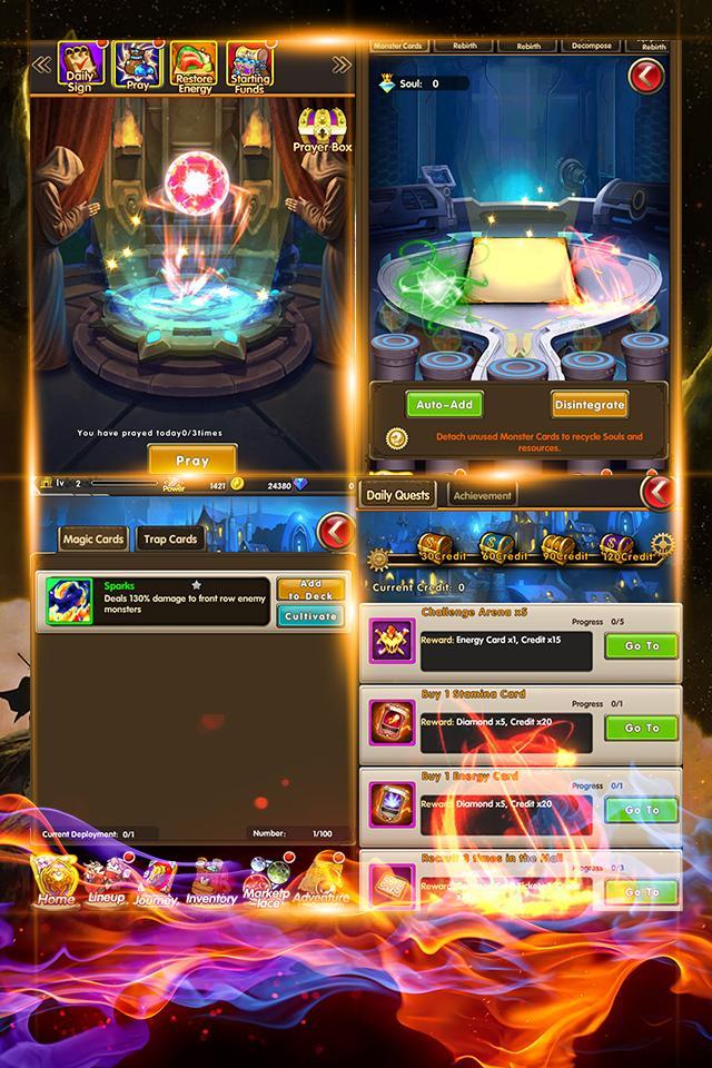 Tower of Duel, Game Academy, Nether Gate and King’s Memory and other distinctive systems help you collect resources and enjoy the fun of the game. Each card can activate different fates and passive effects after upgrading, integration, adjustment, ceremony, equipment, artifact and other armed forces! Cultivate exclusive card groups. There is no strongest card, only the stronger duelist!