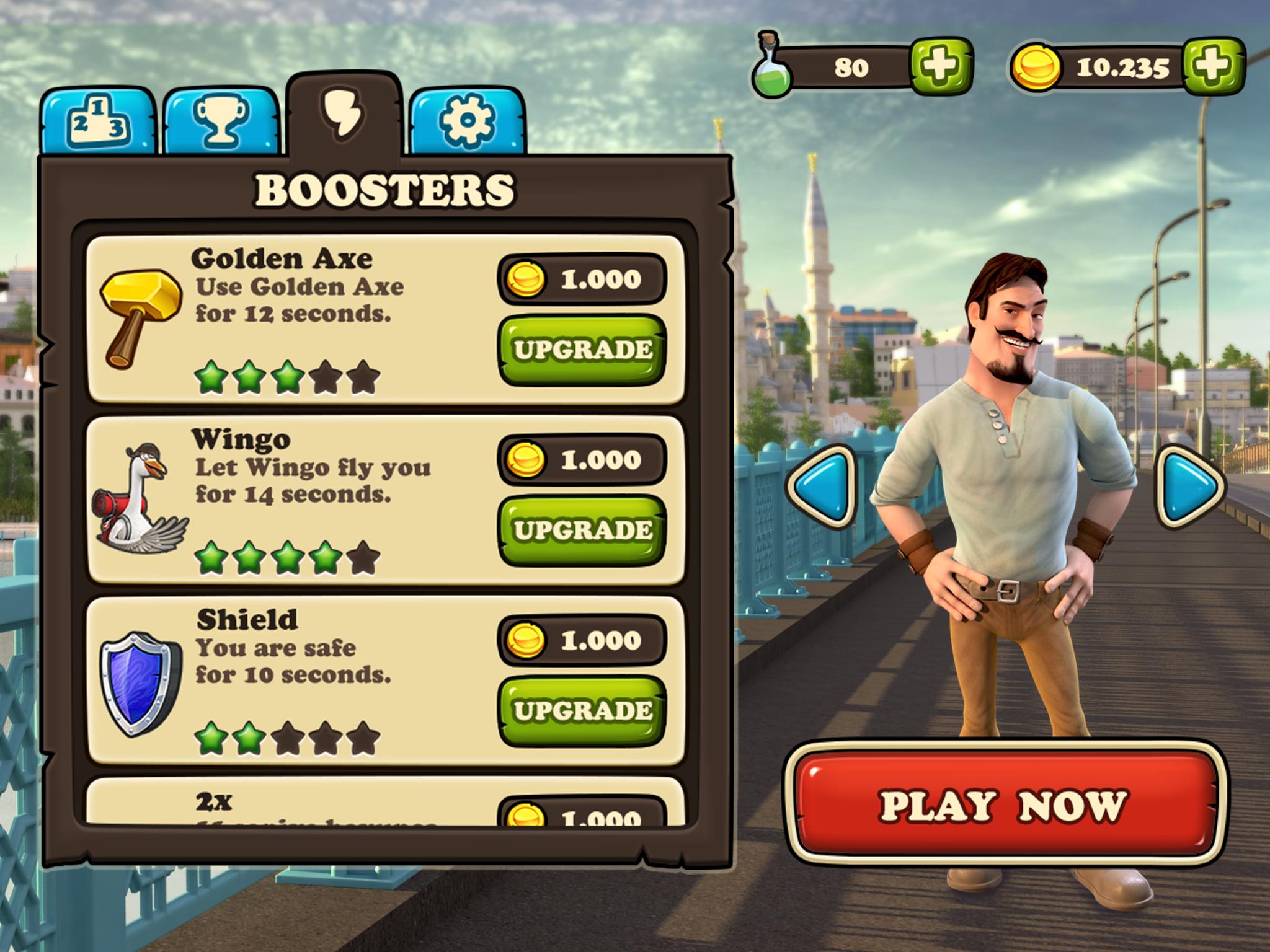 • Many power ups help Evliya on his race! You can even upgrade coin magnets, shiny shileds, golden axe and so on.