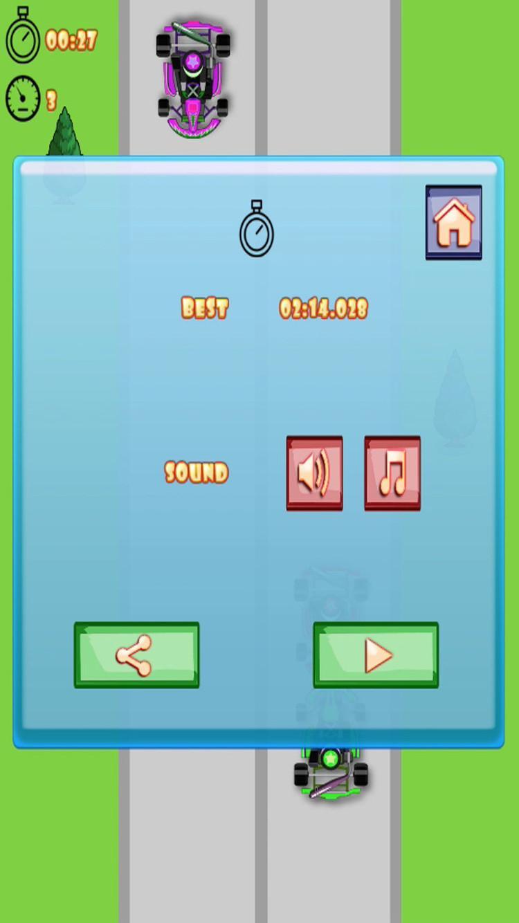 Great reaction times separate the winners from the losers in kart racing. Champion kart racers think and act faster than the competition. With Extreme Karts, the ultimate racing game, you can test your driving skills to the max. Start your kart and dodge oncoming karts as you shift to higher and higher gears! Great reaction times let you keep driving longer and faster. Extreme Karts scores your driving as the seconds and minutes you can stay on the track.