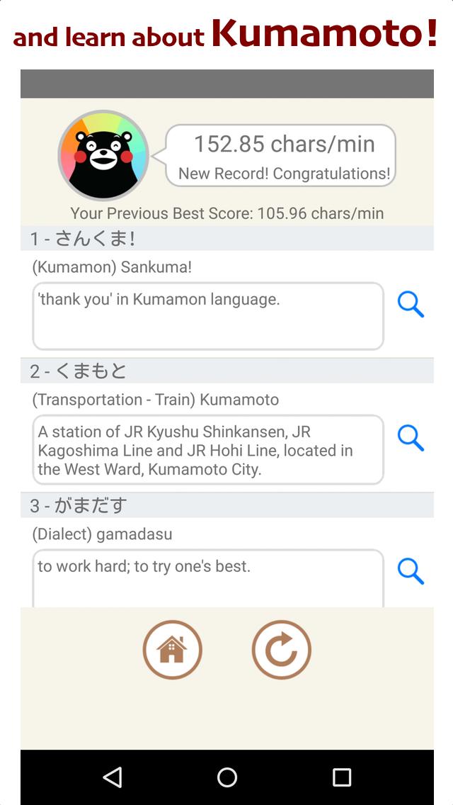 FlicKuma! is an app to improve your typing skills when you type Japanese with the flick input. In this app, your tutor is Kumamon, the mascot of Kumamoto Prefecture, Japan, and you'll be typing words which he shows. All the words are related to Kumamoto, so you'll also learn about the area as you type!