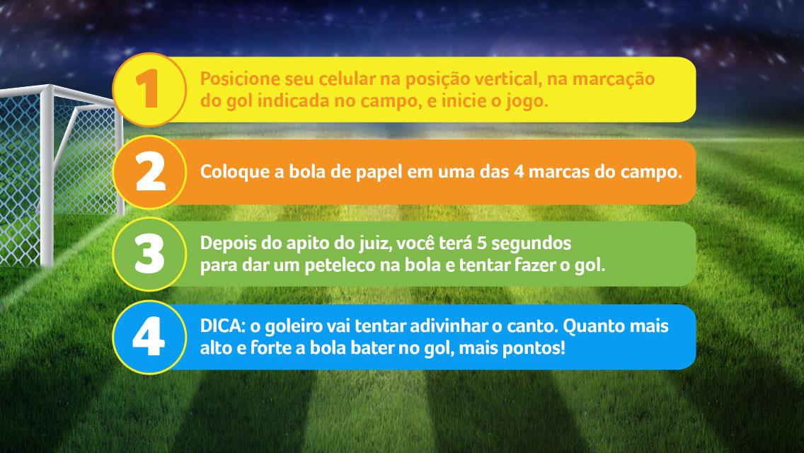 The goal is to "kick" the ball with fingers (known as "peteleco") and hit the goal. The stronger and higher the kick, the more points you will win!