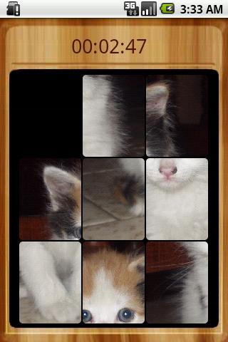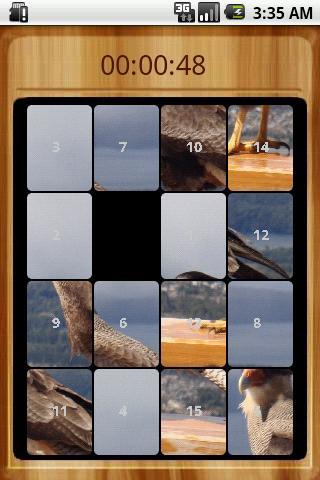 Features include a touch screen interface, multiple puzzle sizes, puzzle picture selection, timer, sound effects and optional numbered tiles.