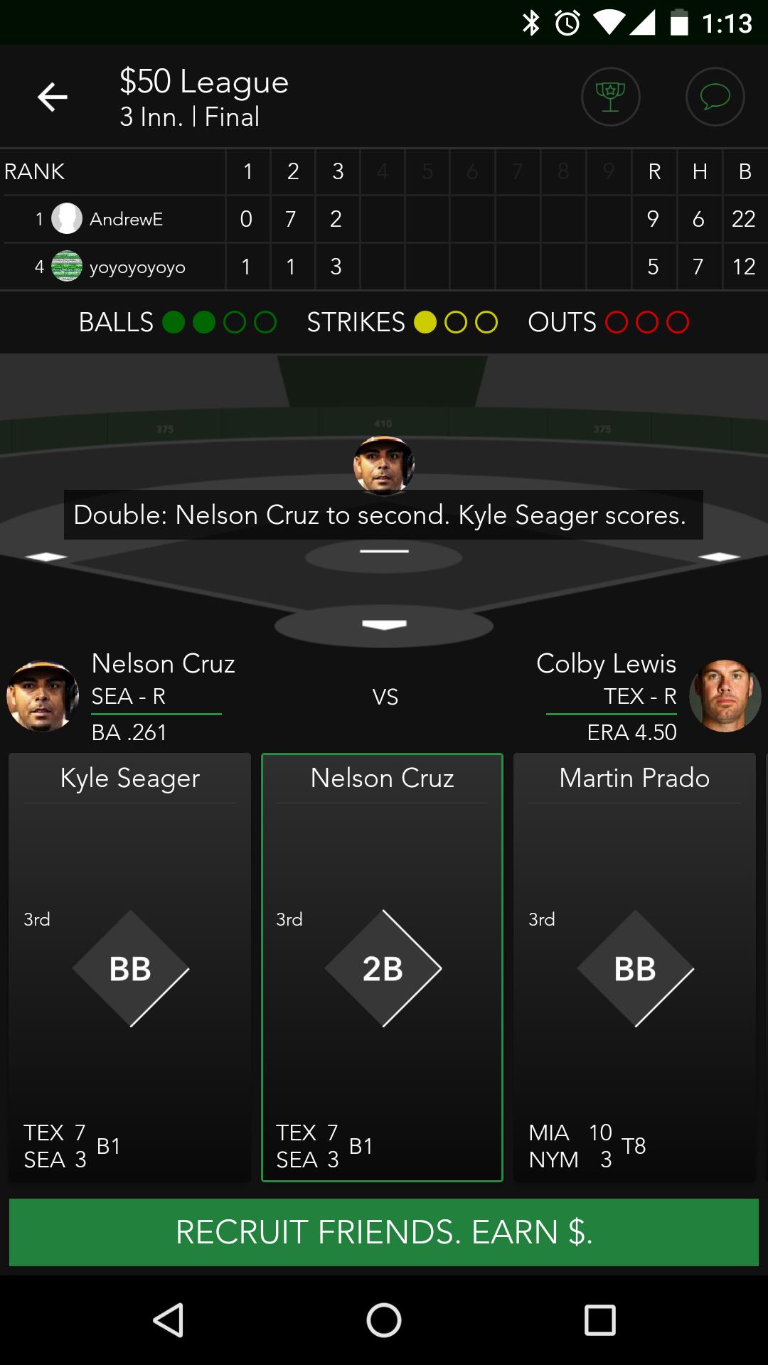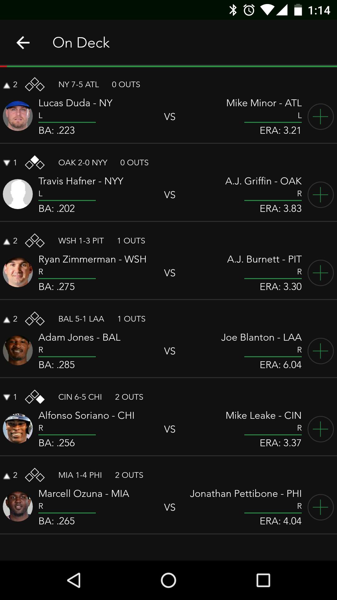 Once the days baseball games start you start to draft your team from a list of batters in the live games. Study the match-ups and choose wisely because the real outcome of your selected player will be used in your game.