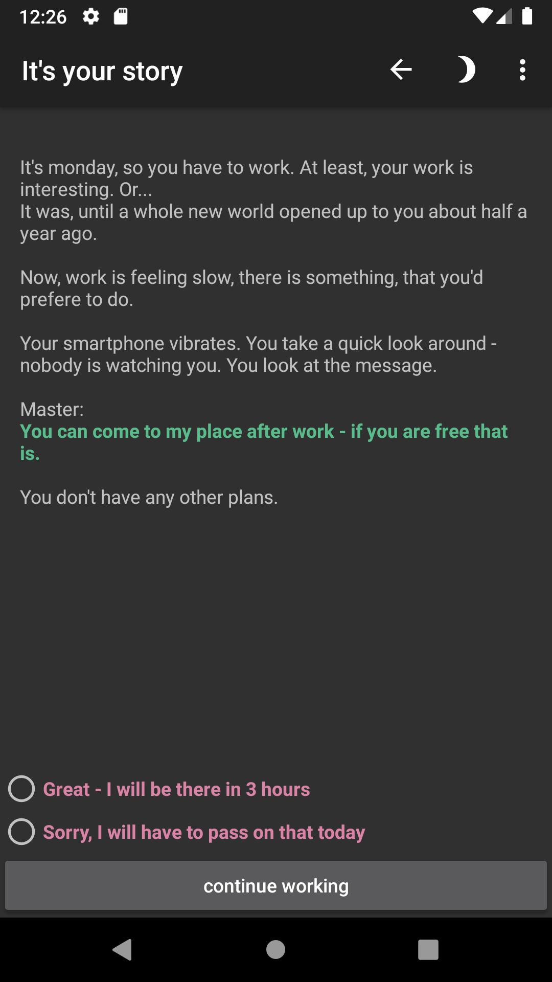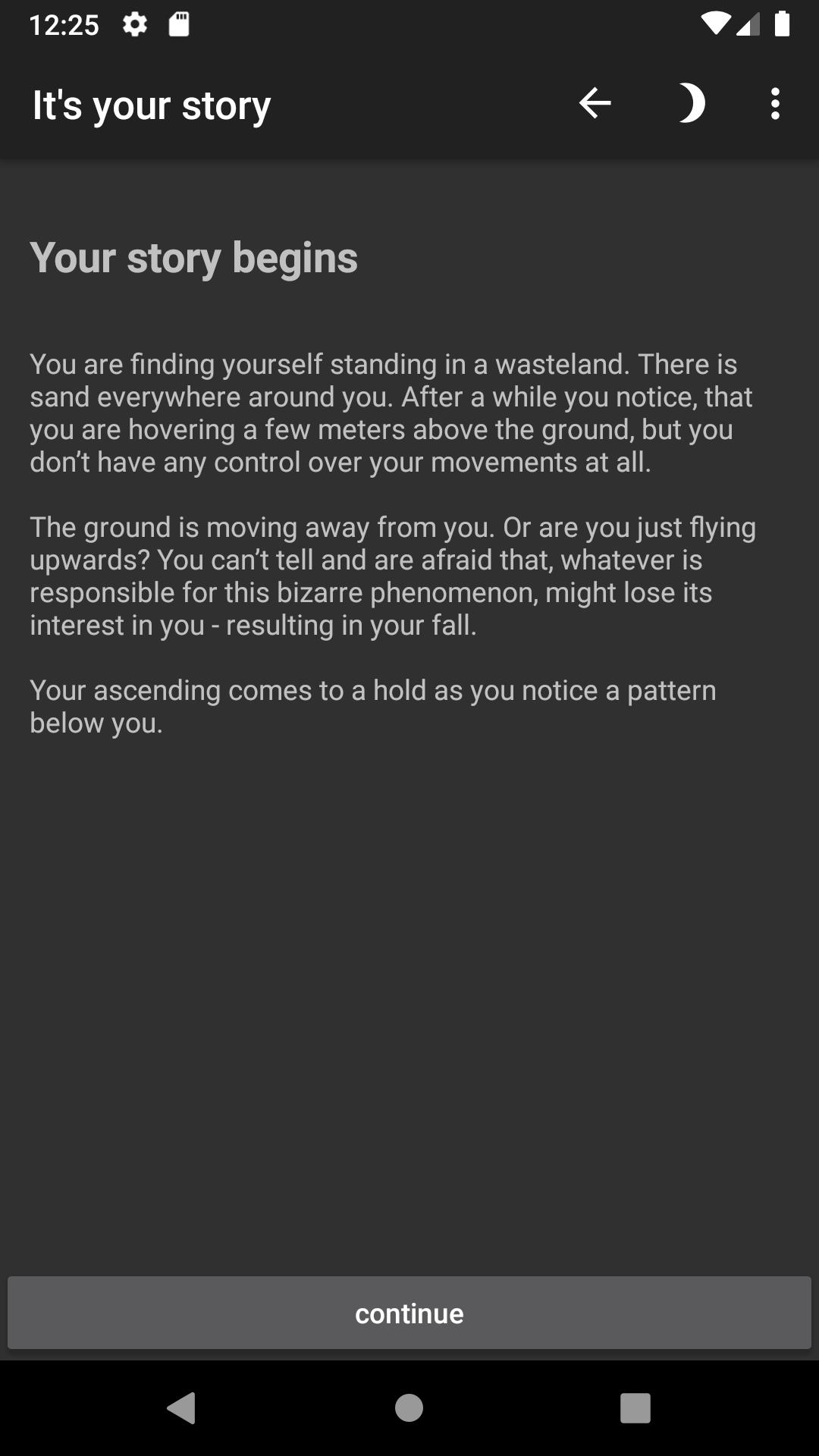 IMPORTANT: As long as this app is in alpha state or until I specify otherwise I do NOT guarantee that the save files will be compatible with updates. I will change that, when the story gets longer, but right now, I am still experimenting with the save files.