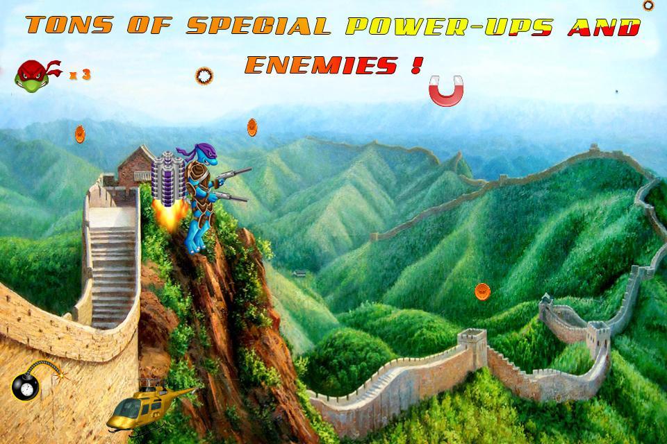 Very simple and fun: Control your Jetpack Cowboy Turtle with your fingers and make him avoid and shoot to destroy the ninja enemies. Unlock different cowboys turtles as you complete the levels! the ninja gang has decided to invade all the main countries in the world!