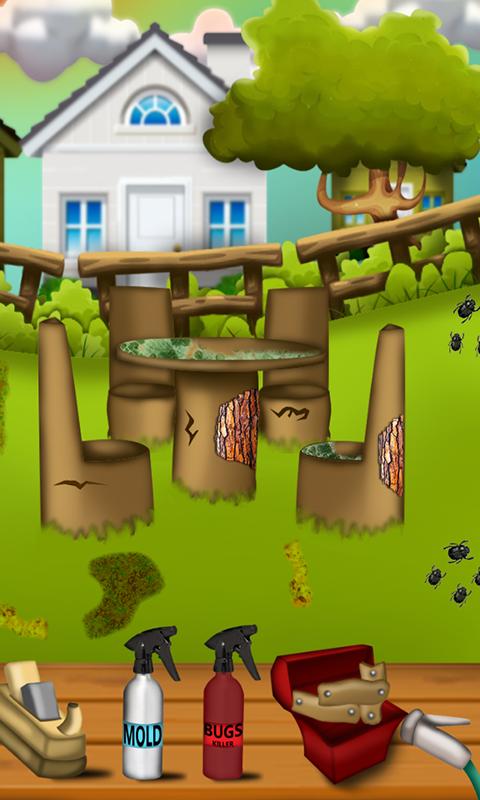 We present you an amazingly fun cleaning game. If you like nature and flowers you will love this game for sure because the action of the game goes on in a beautiful garden. Your job is to clean the garden and make it look well cared. Start with the area where the beautiful flowers grow. You have a series of tools that you need to use as follows. Start with the shovel and remove the extra soil that can be found between the flower rows and on the grass. Then use the rake to remove the branches and the air blower to get rid of the leaves. Use the gardening scissors to cut the bushes and the water hose to make the lawn clean and nice. Since this area looks nice and clean, it is time to take a look at the resting area in our beautiful garden. You can see an old rustic table and chairs that don’t look that good anymore and you need to change that. First of all use the jointer to polish the rough surface from the table. Next use the mold liquid to remove the green mold from the table and chairs. Get rid of the bugs using the insecticide and repair the old wooden chairs using the wood pieces. Finally wash of all the dirt using the water hose. The garden looks amazing now. Great job!