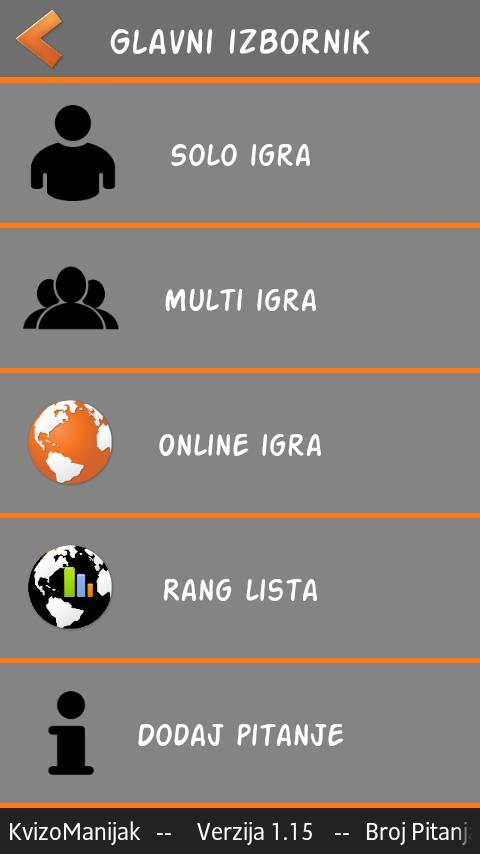 KvizoManijak can be played in three ways. The first is online game where you play against all opponents who are currently online. Another way is a multiplayer game where you can play against a few friends. The third way is a solo game in which you play alone and prepare for online or multiplayer game.