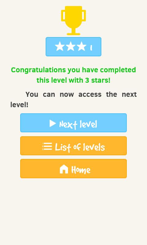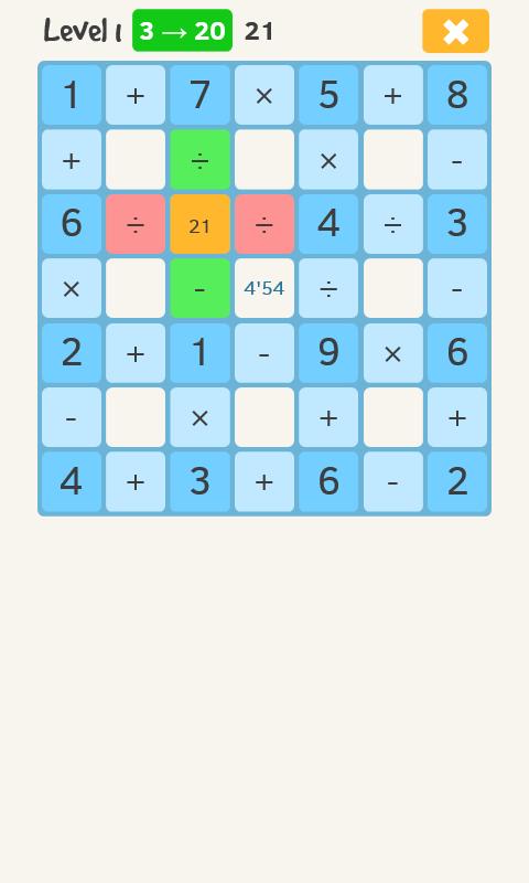 You are given an initial number, and, by moving the orange tile on the tiles next to it, you change the value of your counter until it reaches the goal number. You are able to change the value back thanks to the operators and numbers changing. The less moves you make, the more stars you will get for each levels. Be careful, for when time runs out, you will lose the game...