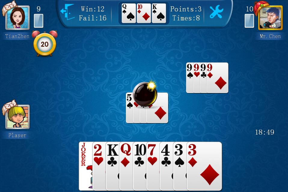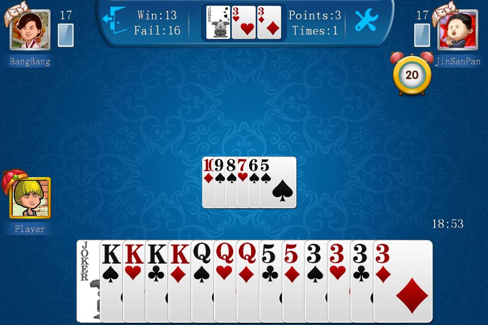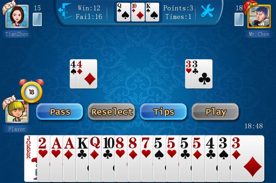 There are three kinds of risk stakes, 1, 2, and 3, with 1 being the lowest and 3 being the highest. Generally, the more confident a player is in the strength of one's cards, the higher the risk stakes one is willing to bid. In most of the online game rooms, the first bidder is chosen randomly by the system. In reality, players usually make up their own rules as to who gets to bid first. For example, some rules stipulate that the player who gets hearts three is the first bidder. If hearts three is in the "kitty" cards, the first bidder will be the one who gets hearts four and so on.