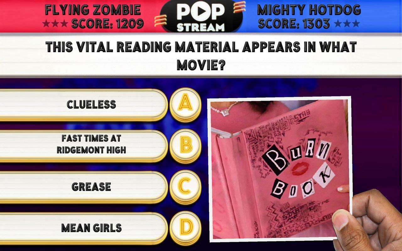 Pop Stream™ turns real movie clips and stills into a buzz-in trivia game show!