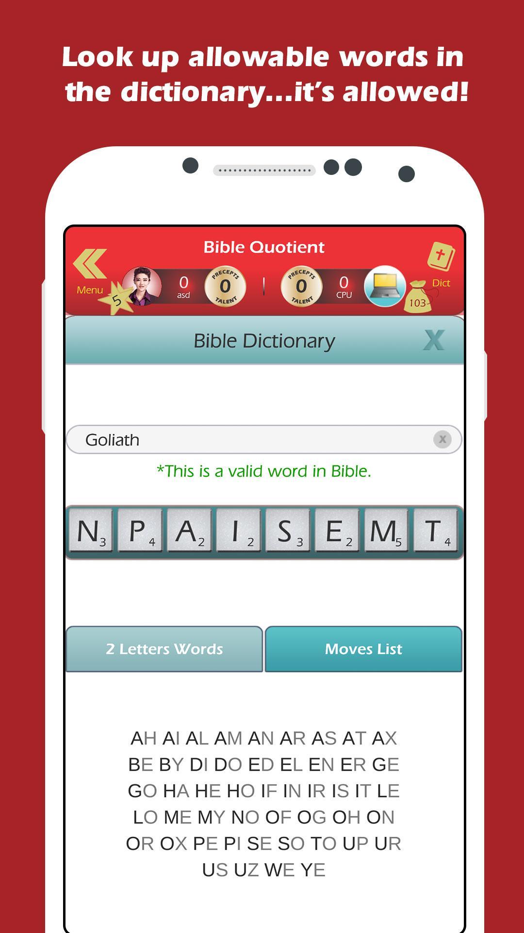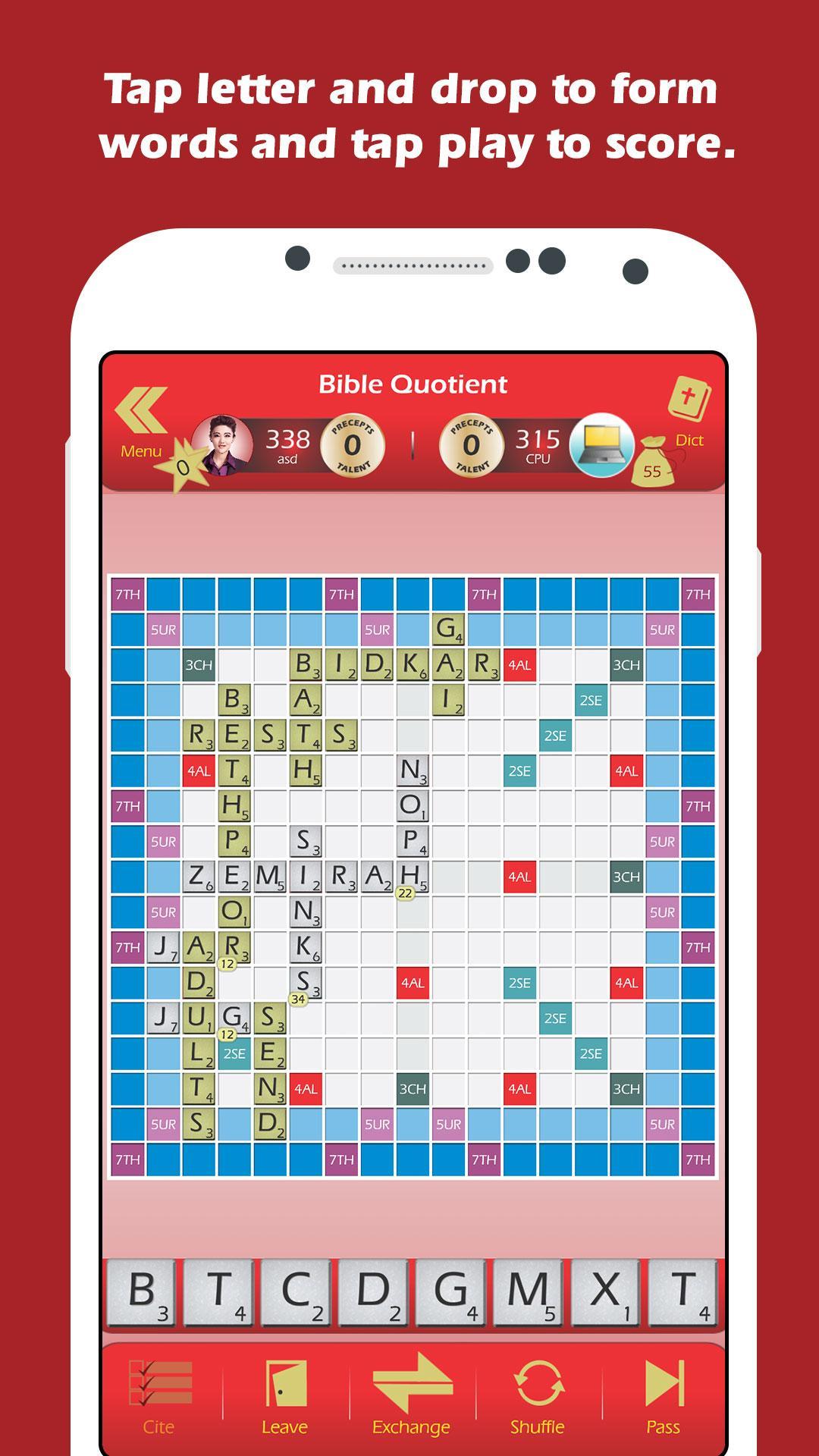 Precepts is a type of crosswords board game. You earn points by forming words found in the Holy Bible on the board in crossword pattern, horizontally and vertically (words flow left to right in rows or downwards in columns). Placing letters on any of the 5 bonus squares boosts your score. Precepts allows English words mentioned in the Bible, as well as words exclusive to the Bible, such as names of places, persons and title of books in the Bible. The player’s Bible intelligence is the Bible Quotient: game score based on 2 scales. First, game points are earned for words spelt. Then a higher score scale, the number of Talents won for correct citation of Bible references. You win a Talent (golden coin) by forming the name of a Bible character on the Thummim (7TH) premium square.