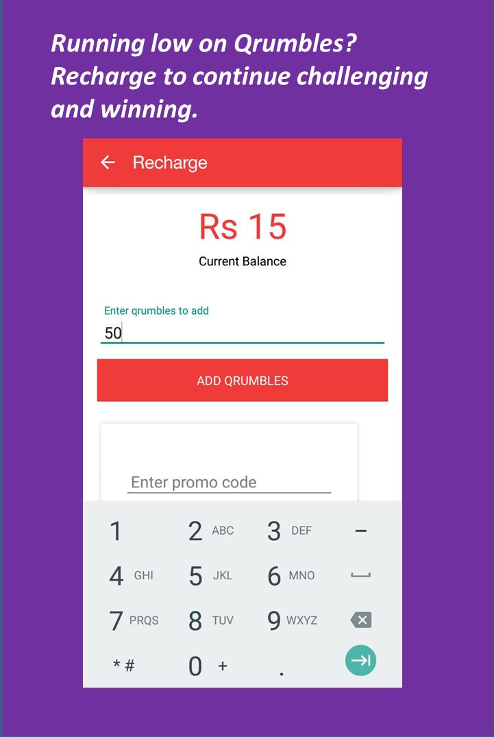 QrumbleBox will help you win money by playing a quiz within 50 seconds. The real essence that is brought to the fore front is the fun of beating your friend in a bet. Our users define us as the "lagi 10 ki" app, where they challenge their friends to a topic and play an interesting and fun filled quiz. The winner gets to take away not just PayTM cash, but pride and honor are his rewards too.