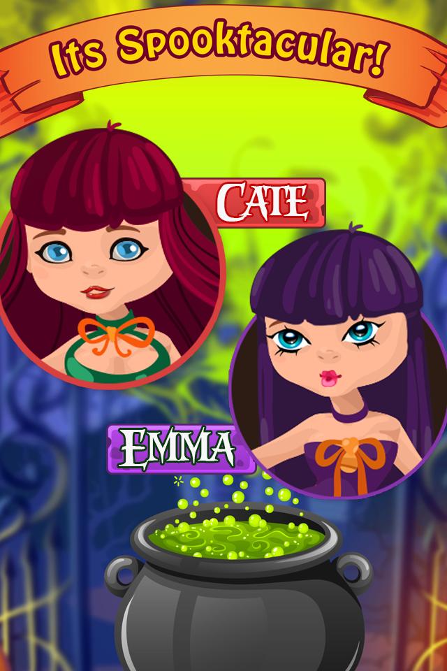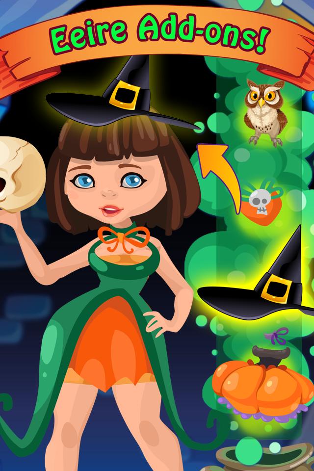 Style her hair; pick clothing, masks and colorful hats, and even scary pumpkins to complete the spooky girl impression.