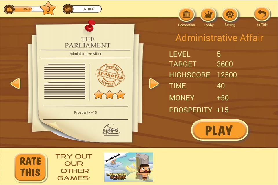 After each level, you will unlock more things to decorate your court room to your liking and see how your country prosperity grows.