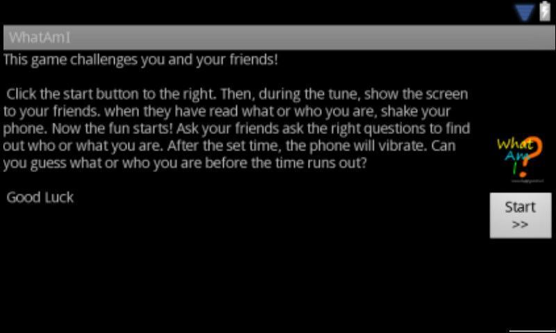 Press the start button and show the screen to the other players. After they've read what (or in some cases, who) you are, shake the phone. Now, the fun starts! Can you guess what you are before time's up?