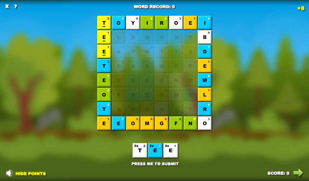 Tap on the letters to create a word, every word found will unlock new letters. Get the combo points for creating a words from the same letter colors (if the color of the selected letter is the same as the color of the first letter in your word). Press the green arrow in the bottom right corner to submit your score!