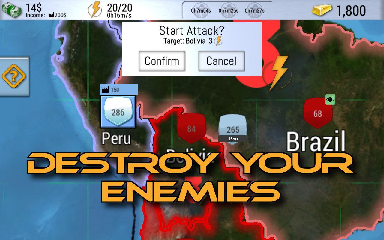 Your mission in this FREE global strategy game: Select any one of 43 available countries and CoD - conquer or destroy - the world. But be warned, your enemies will not give up without a fight. Looking for a bigger challenge? Face off against the living dead devouring the planet and compete with other players in the top score rankings. Still not enough? Activate HARD mode and fight longer and more challenging battles! Only the best will survive. Do you want to know more?