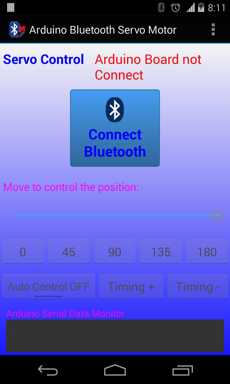 Arduino Bluetooth Servo Motor Control Application memungkinkan Anda untuk mengontrol posisi motor servo. (0 - 180 derajat)