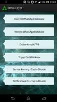 Omni-Crypt berjalan sebagai layanan latar belakang dan akan memantau dan mengonversi file WhatsApp .Crypt5-12 menjadi .Crypt Warisan Enkripsi. Ini berarti bahwa aplikasi yang belum diperbarui untuk mendukung format enkripsi tambahan ini akan terus berfungsi dengan benar. Dukungan terintegrasi untuk versi warisan cadangan SMS+ disertakan. Aplikasi ini juga dapat digunakan sebagai decrypter / recrypter .Crypt5-12 yang berdiri sendiri.