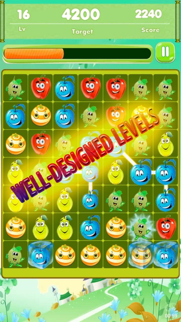 Happy Fruit Connection dengan mencocokkan tiga atau lebih buah identik, geser jari Anda dan sambungkan ke blitz buah dan jus.